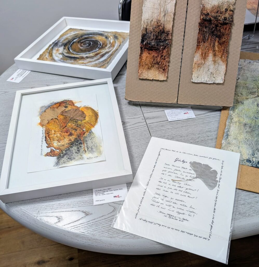 Wie bereits im letzten Jahr stellte auch in 2025 die Wasserburg Haus Unterbach Kunstschaffenden Ausstellungsfläche zur Verfügung. Hier konnte man das Kunsterlebnis mit einem Herbstspaziergang durch den wunderschön angelegten Park verbinden. „Es ist ein Geschenk des Himmels, dass wir diese tollen Räumlichkeiten nutzen können“, erzählte Christa Diefenbach, die dort ihre Steinskulpturen präsentierte. Im Kontrast zur Halle der Wichernschule bietet ein Kamin hier wohlige Wärme und lädt ein, die Kunst in aller Ruhe und gemütlicher, familiärer Atmosphäre zu betrachten.