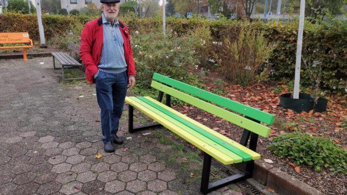 Seit dem 16. Oktober ist die dritte von den Unterfeldhaus-AKTIVEN in den Erkrather Logo- Grünfarben gestrichene Ruhebank fertig und lädt nun auf dem Neuenhausplatz als hübscher Farbtupfer zum Verweilen ein.