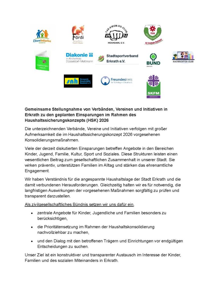 Zwei Vertreter des Tea-Kwon-Do Clubs Erkrath erklärten, dass die Konsolidierungsliste auch einige Punkte enthält, die zum finanziellen Problem der Sportvereine werden könnten. Genannt sind in der Liste die Erhebung von Nutzungsbeiträgen und eine Beteiligung an den Bewirtschaftungskosten für Sporthallen und Sportstätten bei möglicher Weise gleichzeitiger Kürzung der Zuschüsse, die die Vereine von der Stadt erhalten. Die beiden kritisierten, dass die Vereine nicht einbezogen werden. Sport sei eine wichtige Säule in der Kinder- und Jugendarbeit.