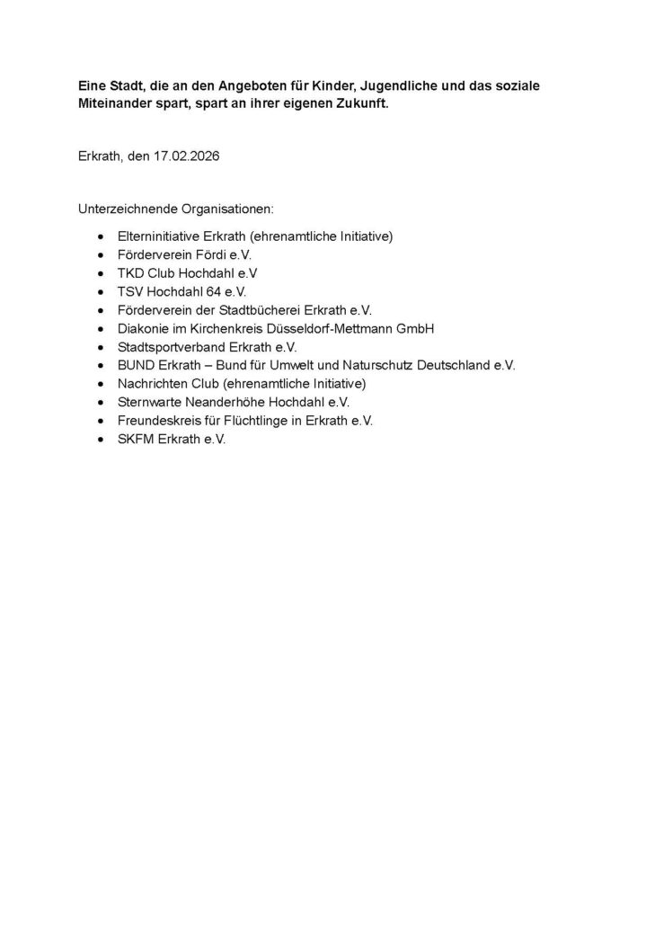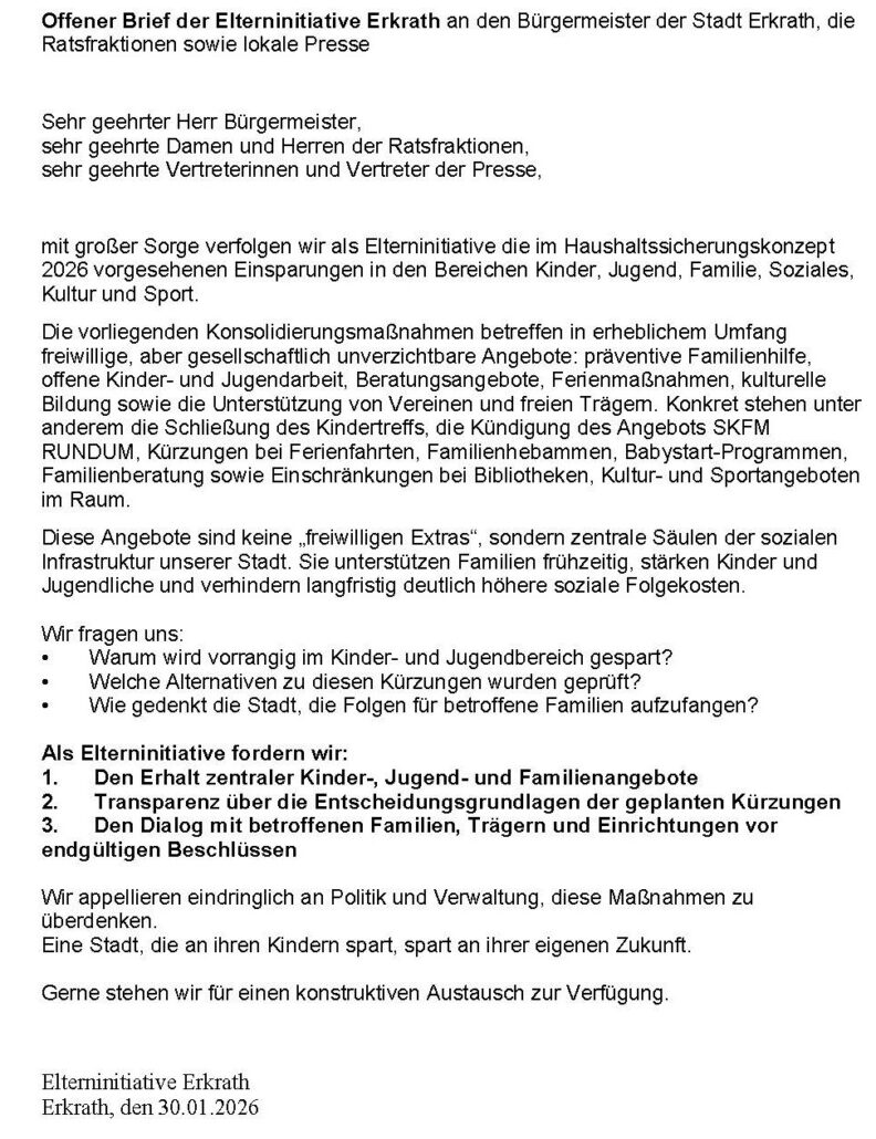 Was erst einmal logisch klingt und auf Seiten von Verwaltung und Politik vielleicht sinnvoll erscheint, sorgt in der Öffentlichkeit für Unruhe. Schon kurz nachdem Teile der Liste der möglichen Konsolidierungsmaßen im Ratsinformationssystem für die betroffenen Ausschüsse veröffentlicht wurden, gründete sich eine Elterninitiative für Erkrath. „Wir haben uns in einer WhatsApp-Gruppe zusammengefunden. Es steht ja auch die komplette Schließung des Kindertreffs im Raum, so wie viele weitere Maßnahmen, die Familien, vor allem Kinder, aber auch Senioren betreffen“, sagt Schabestan Gafori, die inzwischen die Koordination übernommen hat. Schon Ende Januar verfasste die Elterninitiative einen offenen Brief, in dem sie ihre Sorgen an den Bürgermeister, den Rat und an die Presse mitteilte.