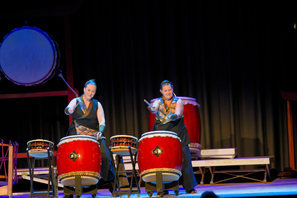 Mit welcher Geschwindigkeit die Mitglieder sich bewegen und trommeln, konnte man eindrucksvoll sehen, als ein Trommelstock durch die Luft auf die Bühne flog. Woher der Trommler so schnell einen neuen Stock in der Hand hatte, hat niemand so recht gesehen. Aus dem Takt kam auch niemand. Die teils sieben Minuten langen Stücke boten mal leise Töne, mal sehr laute, mal langsamere und dann in schneller Abfolge Trommeltöne, einem Gewitter gleichend, zudem dann auch die Bühnenbeleuchtung passend wie bei Blitz und Donner wechselte. Taiko ist immer wieder ein Erlebnis, für die Augen, für die Ohren und für den ganzen Körper, denn wer nah an der Bühne sitzt, spürt die Vibration der Trommeln.