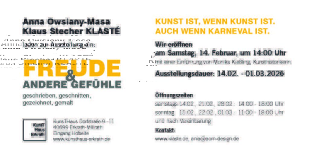 Unter diesem Titel stellen Anna Owsiany-Masa und Klaus Stecher Klasté vom 14. Februar bis 1. März 2026 gemeinsam im Kunsthaus Erkrath aus.