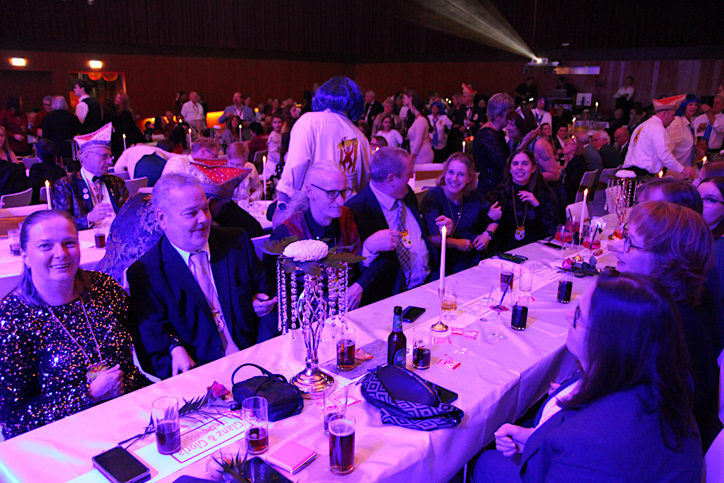 Die Tische der Stadthalle waren festlich mit Samt-Tischdecken, Sitzbezügen, Kronleuchtern auf den Tischen und Kerzenhaltern mit LED-Kerzen geschmückt. Viele Besucher kamen in feierlicher Abendgarderobe. Moderiert wurde der Abend von den beiden Vorsitzenden der Letzten Hänger Werner Scheter und Hajo Fritsch sowie vom 1. Vorsitzenden der Düssel-Garde Lutz Kraft.