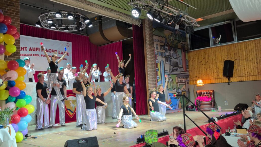 Für weitere ausgelassene Stimmung sorgten die Dancing Donkeys, die mit ihrem beliebten Bühnenprogramm aus Tanz und Humor erneut überzeugten. Die tanzenden Fußballer des SC Unterbach heizten den Jecken im Saal noch einmal kräftig ein. Den krönenden Abschluss der vereinseigenen Programmpunkte bildete die Showtanzgruppe. Mitglieder aus allen Bereichen des Vereins hatten eine aufwendige Choreografie einstudiert und präsentierten sich in absoluter Bestform – ein Auftritt, der noch einmal für große Begeisterung sorgte. Nach dem Auszug des Elferrates aus der Halle ließ die Band Puddelrüh den Abend musikalisch ausklingen, bevor der DJ übernahm und bis tief in die Nacht ausgelassen weitergefeiert wurde.