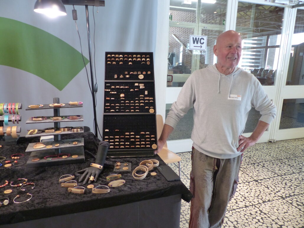 Ein ‚alter Bekannter‘ ist indes Michael Nelles aus dem Ahrtal. Der ehemalige Licht- und Akustiktechniker u.a. von der Taikogruppe WADOKYO hatte nach seiner Verrentung zu seinem Hobby gefunden. Angefangen hat es mit der Bitte seiner Tochter eine Kette für sie anzufertigen. Anschließend hat er sich auf die Herstellung von Holzschmuck konzentriert und bietet nun sein Hartholz Schmuckdesign in Erkrath. Aber seine Leidenschaft ist ein reines Hobby geblieben. Sein Stand war wieder einmal eine Augenweide.