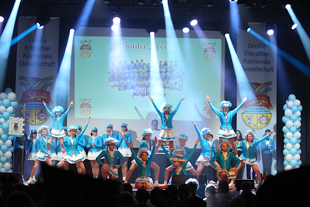 Noch mehr Tanz gab es vom OC Danceteam, die als Tanzgarde der ‚Letzten Hänger‘ gekommen waren. Fünf Karnevalstänze zeigte die Gruppe der „OC Fire“ und mit einer rockigen Zugabe auch Künste, mit denen sie bei internationalen Wettbewerben antreten. Später wurde die Bühne richtig voll, als die Tanzgarde der Katholischen Jugend aus Düsseldorf KaKaJu mit 35 Tänzerinnen und eigens genähten Kostümen auf der Bühne zum Motto „Liebe gewinnt“ einen Showtanz aufführten.