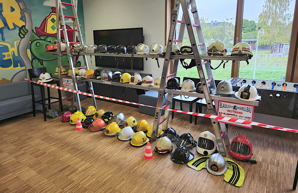 Große Augen konnte man im Gruppenraum der Kinder- und Jugendfeuerwehr machen. Dort hatten die Modellbauer von „Blaulicht-Modellbau Mettmann“ eine Auswahl ihrer Modelle aufgebaut. So wurde die Bildung einer Rettungsgasse im Modell gezeigt, außerdem gab es historische Modelle der Feuerwehr Mettmann zu sehen. Auf einer Leiter-Konstruktion wurde eine Sammlung von Feuerwehr-Helmen aus der ganzen Welt gezeigt.