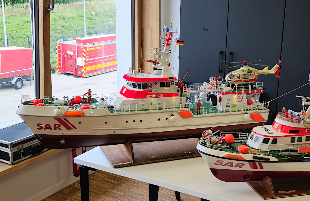 Auf weiteren Tischen waren große Modelle von Rettungsbooten aufgebaut – von Seenotrettung über Feuerwehr bis zu einem Polizei-Boot. Alles Maßstabsgetreu nachgebaut, sagte einer der Herren, dass er etwa zwei Jahre an so einem großen Modell baut, bis es fertig ist.