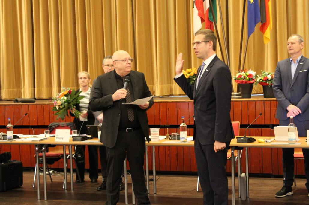 Der Rat ist in dieser Ratsperiode auf 52 Mitglieder angewachsen. „Ich blicke in die Gesichter vieler neuer Ratsmitglieder. Herzlich willkommen“, begrüßte Wolfgang Jöbges die Anwesenden. Als Dienstältestes Ratsmitglied leitete er die Sitzung bis zur Vereidigung des Bürgermeisters. „Mit Deiner Wiederwahl haben die Wähler nicht nur Dich als Person gewählt, sondern auch Deine Arbeit“, richtete er seine Worte an Christoph Schultz, der nach seiner Vereidigung die Sitzungsleitung übernahm. „Auf uns warten zahlreiche, teils anspruchsvolle Herausforderungen, insbesondere im Bereich der städtischen Infrastruktur, die trotz angespannter Haushaltslage bestmöglich zum Wohle unserer Stadt und unserer Bürgerinnen und Bürger gelöst werden müssen. Damit dies gelingt, sind konstruktive Gespräche sowie Mut, Zuversicht und Elan beim Mitgestalten unserer Stadt erforderlich“, apellierte er an den neuen Stadtrat, der an diesem Tag ebenfalls vereidigt wurde.