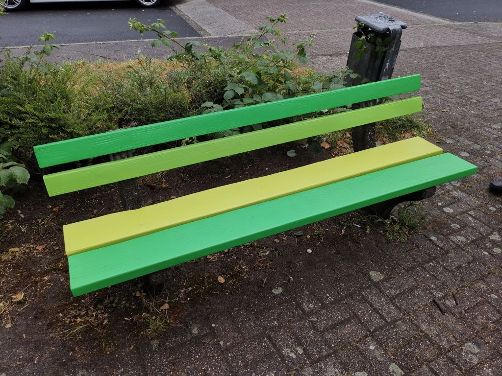 Im Rahmen der Projektplanungen für das laufende Jahr stand der farbige Anstrich von einzelnen Sitzbänken im Stadtteil auf der Agenda. Im Laufe der Beratungen über das Wie und Wann kristallisierte sich die Idee heraus, zuerst die Sitzbank an der von Unterfeldhaus-AKTIV betreuten Wildblumenwiese im Grünzug zwischen Niermannsweg und Feldhausweg in den drei Grüntönen des Logos der Stadt Erkrath anzustreichen.