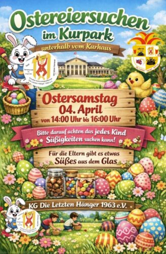 Auf die Suche können sich Kinder zwischen 14 und 16 Uhr begeben. Für die Eltern gibt es etwas Süßes aus dem Glas. Nach dem Auftakt im vergangenen Jahr wird die Osteraktion erneut von der Karnevalsgesellschaft „Die Letzten Hänger“ organisiert. Es wird gebeten, Körbchen für die Suche selbst mitzubringen. Außerdem appellieren die „Hänger“ an Fairness, damit jedes Kind eine Osterüberraschung bekommen kann.