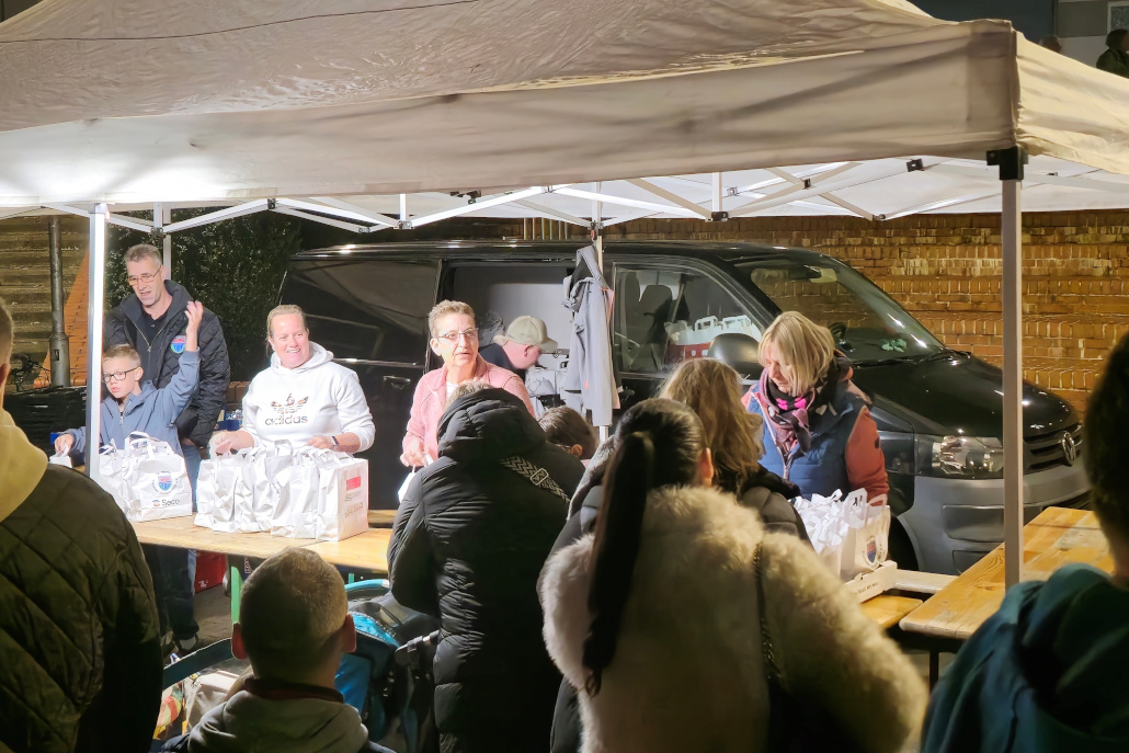 Anschließend durften sich die Kinder eine Martinstüte abholen – über 600 Tüten hatten die Ercroder Jonges dank zahlreicher Sponsoren wieder gepackt. Während es Kinderpunsch in Pappbechern gab, wurde Glühwein in über 100 Tassen gegen Pfand ausgeschenkt. „Das ist ein Probelauf, um nachhaltiger zu werden. Im nächsten Jahr werden wir mehr Tassen haben“, kündigte Mitglied Jörg Albert an. Außerdem wurde für den (vom Pfand abgesehen) kostenfreien Glühwein und Kinderpunsch um Spenden gebeten. Die Kinder gingen derweil Grippschen, etwa an der Bavier-Apotheke.