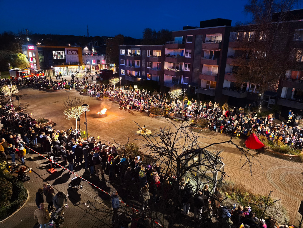 Wie in den vergangenen Jahren ging es von der GGS Erkrath an der Düsselstraße über die Freiheitstraße und Bismarckstraße am Rathaus vorbei durch die Bahnstraße zum Bavierplatz. Hier stellten sich die zahlreichen Kinder mit ihren bunten Laternen im großen Kreis auf, um die Geschichte von Sankt Martin zu hören und der Mantel-Teilung zuzusehen. Dargestellt wurde Sankt Martin erneut von Sophia Zimmermann, den Bettler spielte Janine Pless-Keens, welche kurzfristig für die erkrankte Lena Charlwood eingesprungen war. Die Jugendmusikschule spielte Martinslieder, das Mitsingen der Kinder war aber noch ausbaufähig.
