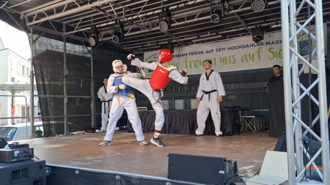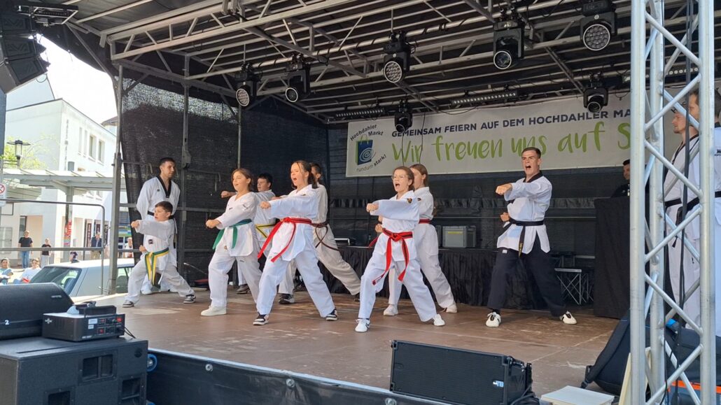 Der erste Vorsitzende des Vereins, Brian Karamann, übernahm die Moderation und kommentierte die einzelnen Demonstrationen. Unterstützung erhielt das Vorführteam vom Sportwart Joshua Finke, dem zweiten Vorsitzenden Patrick Hirt und dem Trainer Aslan Kaplan. Mit einem gesprungenen Yop-Chagi (Seitwärtstritt), ausgeführt von Leon Krämer, wurde das Publikum sofort in den Bann gezogen. Danach zeigten das Trainerteam sowie Mehmet Karabas, Aaliyah Kaplan, Sara Cirillo, Roko Jegrisnik, Ilias Temel, Lina Bongartz und Leon Krämer die Bereiche Grundschule (Techniken), Sparring auf die Pratze (Techniken auf ein Schlagkissen), Formen (Poomsae) und Wettkampf (mit Schutzweste). Als besonderes Highlight zeigten dann die Sportler verschiedene Bruchtests mit unterschiedlichen Schwierigkeitsgraden. Ein Faustschlag auf ein Brett, welches der Kämpfer selbst gehalten hat, zwei synchron ausgeführte Tritte zu zweit oder einen Ballendrehtritt auf Brett, welches in tausend Teile zersplitterte. Der gesamte Auftritt war eine gelungene Demonstration dieser wunderbaren Sportart und zugleich eine gute Werbung für den Hochdahler Verein. Auf einem Infostand neben der Bühne konnten sich Interessierte informieren oder ein paar Techniken auf der Trainingsmatte ausführen.