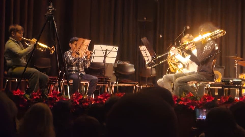 Den Abend rundete zum Schluss dann noch die größte Gruppe der Jugendmusikschule ab: Das Blasorchester unter der Leitung von Torsten Lehmen spielte drei Stücke, unter anderem ein Medley „Christmas on Broadway“. „Das Blasorchester ist ein sichtbarer Beweis, dass mehrere Generationen gemeinsam musizieren“, erklärte Guido Mallwitz stolz. Unter den drei Stücken fand sich allerdings nicht nur etwas Weihnachtliches, sondern auch ein Klarinetten-Konzert, in dem Davit Sarukhanyan, ein neuer Kollege der Jugendmusikschule ein Solo spielte. Er hat die Klarinettenklasse übernommen und zeigte eindrucksvoll sein Können.