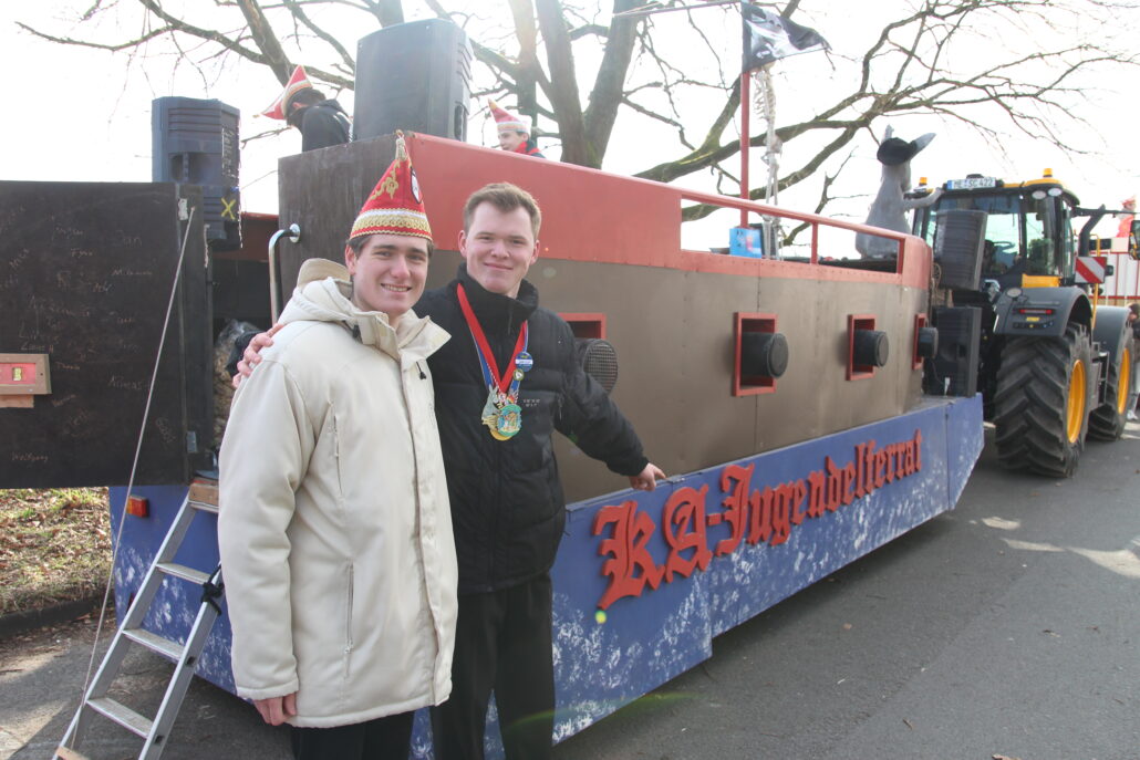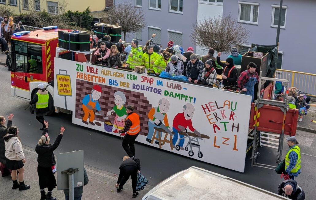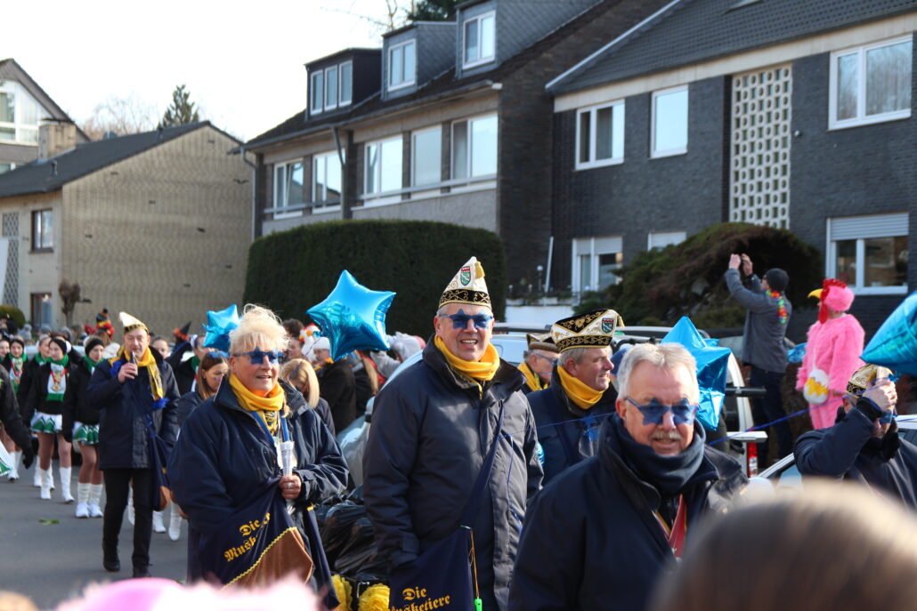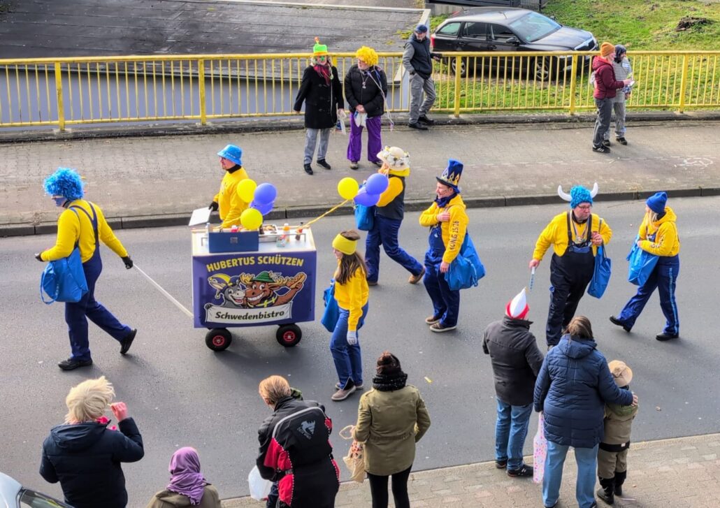 Ob beim Biwak oder in liebevoll eingerichteten Partyzonen vor den Häusern und in Garagen – überall erklang Karnevalsmusik, und die Jecken wärmten sich mit guter Laune. Noch vor dem offiziellen Start ehrten die Ehrenritter die kreativsten Beiträge des Tages. In den Kategorien „schönste Fußtruppe“, „schönster Zugwagen“ und „Sonderpreis“ wurden besondere Ideen ausgezeichnet. Als schönste Fußtruppe sorgten die Hubertus-Schützen für Begeisterung am Straßenrand. Angeführt von Schützenkönig Lars Schweden feiern sie in diesem Jahr ihr ganz persönliches „Schwedenjahr“. Da lag das Motto nahe: das schwedische Möbelhaus IKEA. Mit einem originellen „Schwedenbistro“, auf dem Esel und Elch um die Wette strahlten, zogen sie durch die Straßen.
