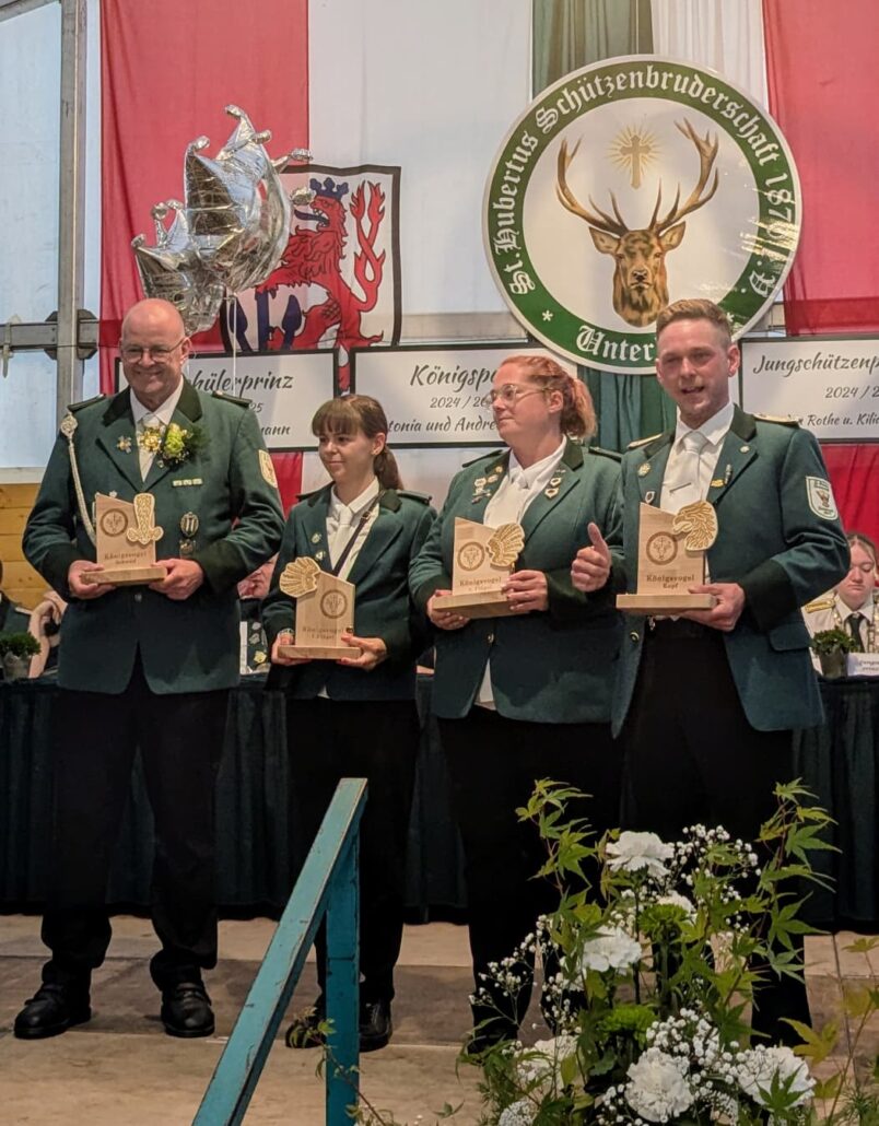 Am Montag um 16 Uhr stand das Königs- und Prinzenvogelschießen an. Merle Schweden erschoss sich den Titel des Jungschützenprinzen. Um 19.13 Uhr gelang Lars Schweden (wir berichteten) dann der entscheidende Treffer und er stand als neuer Schützenkönig, gemeinsam mit seiner Ehefrau Sabine, fest. Damit steht die gesamte Familie Schweden im Königsjahr 2025/2026 an der Spitze der Schützenbruderschaft, denn auch Tochter Jule wird ihren Eltern mit ihrem Partner als Adjutant zur Seite stehen.