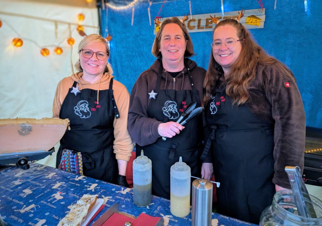 Besonderer Beliebtheit erfreute sich wieder einmal der Raclette-Stand, der für viele Besucher längst ein fester Bestandteil des vorweihnachtlichen Wochenendes ist. Seit nunmehr 24 Jahren sind hier Anja Bongen, Birgit Wolfram und Jeanine Maire zuverlässig anzutreffen. „Wir sind da damals eher zufällig reingerutscht“, erzählt Anja Bongen lachend. „Aber wir haben so viel Spaß daran, dass wir jedes Jahr immer wieder gerne mit dabei sind.“ Im kommenden Jahr steht für das Trio sogar ein Jubiläum an: 25 Jahre Raclette auf dem Unterbacher Weihnachtsmarkt.